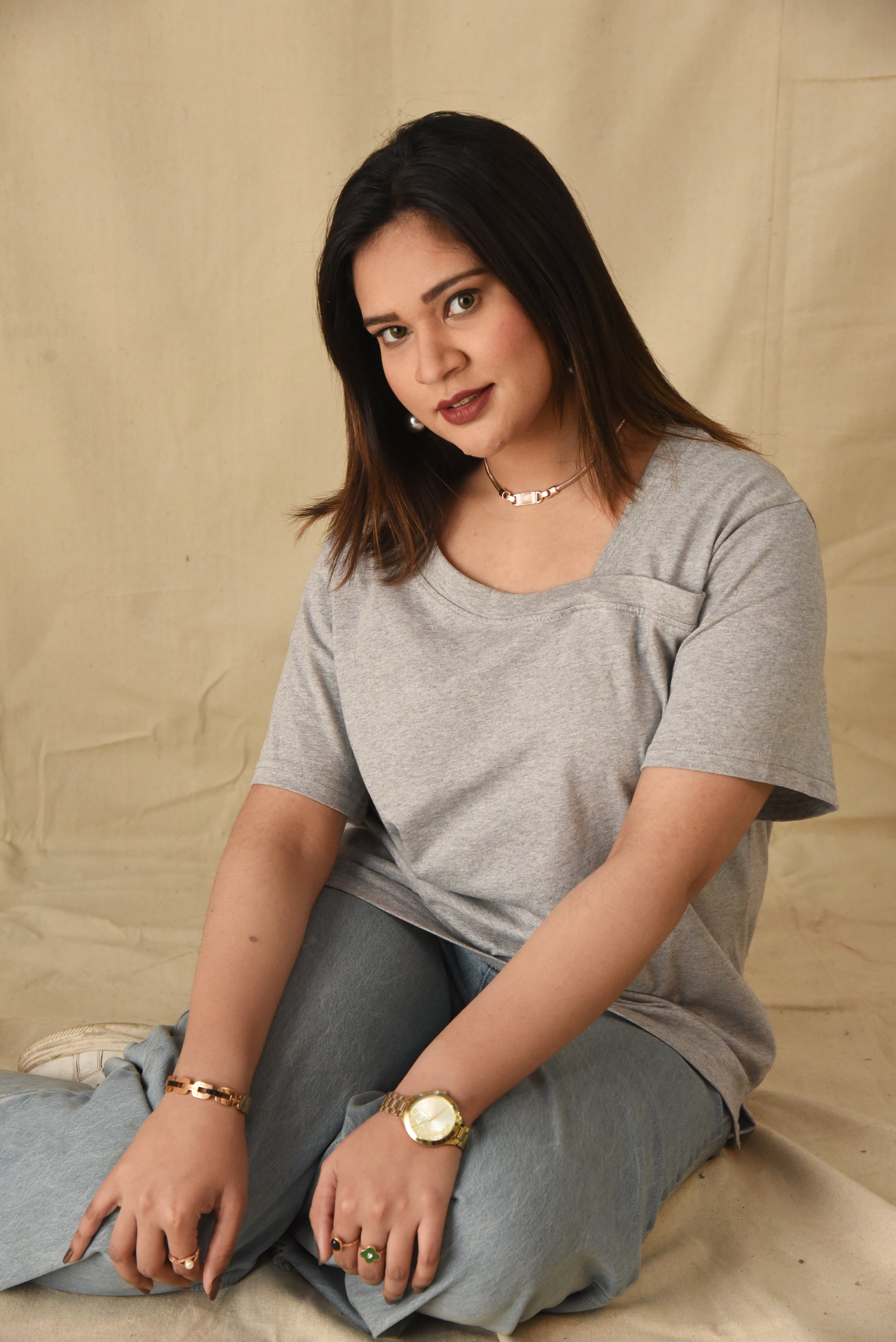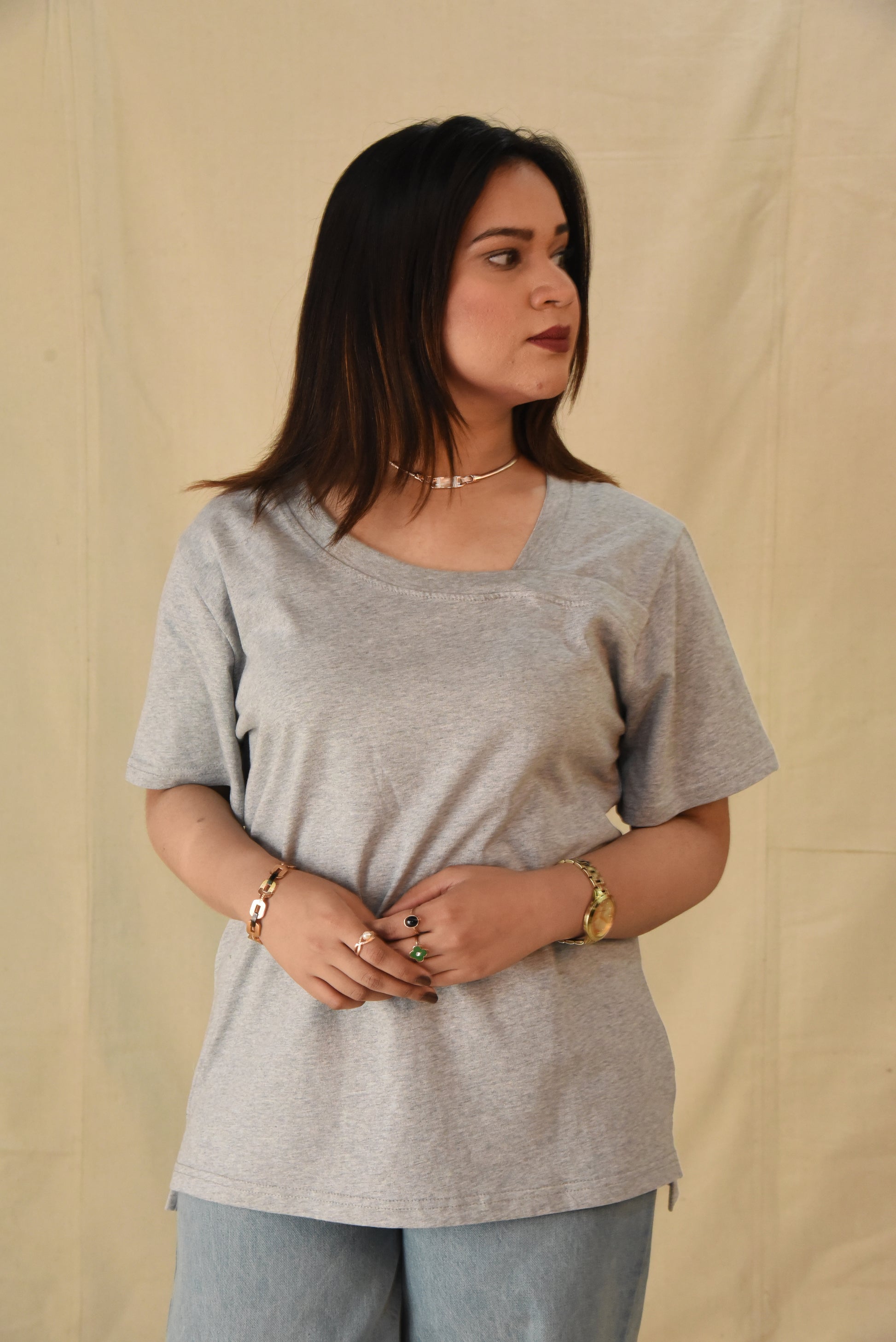 This women's grey tee is a stylish and unique addition to any wardrobe. Designed with a relaxed fit, it features an asymmetrical neckline that adds a modern, fashion-forward touch. The soft grey color offers a versatile and timeless appeal, easily pairing with a variety of outfits. Crafted from comfortable, breathable fabric, this tee is perfect for all-day wear—whether you're dressing it up or keeping it casual.