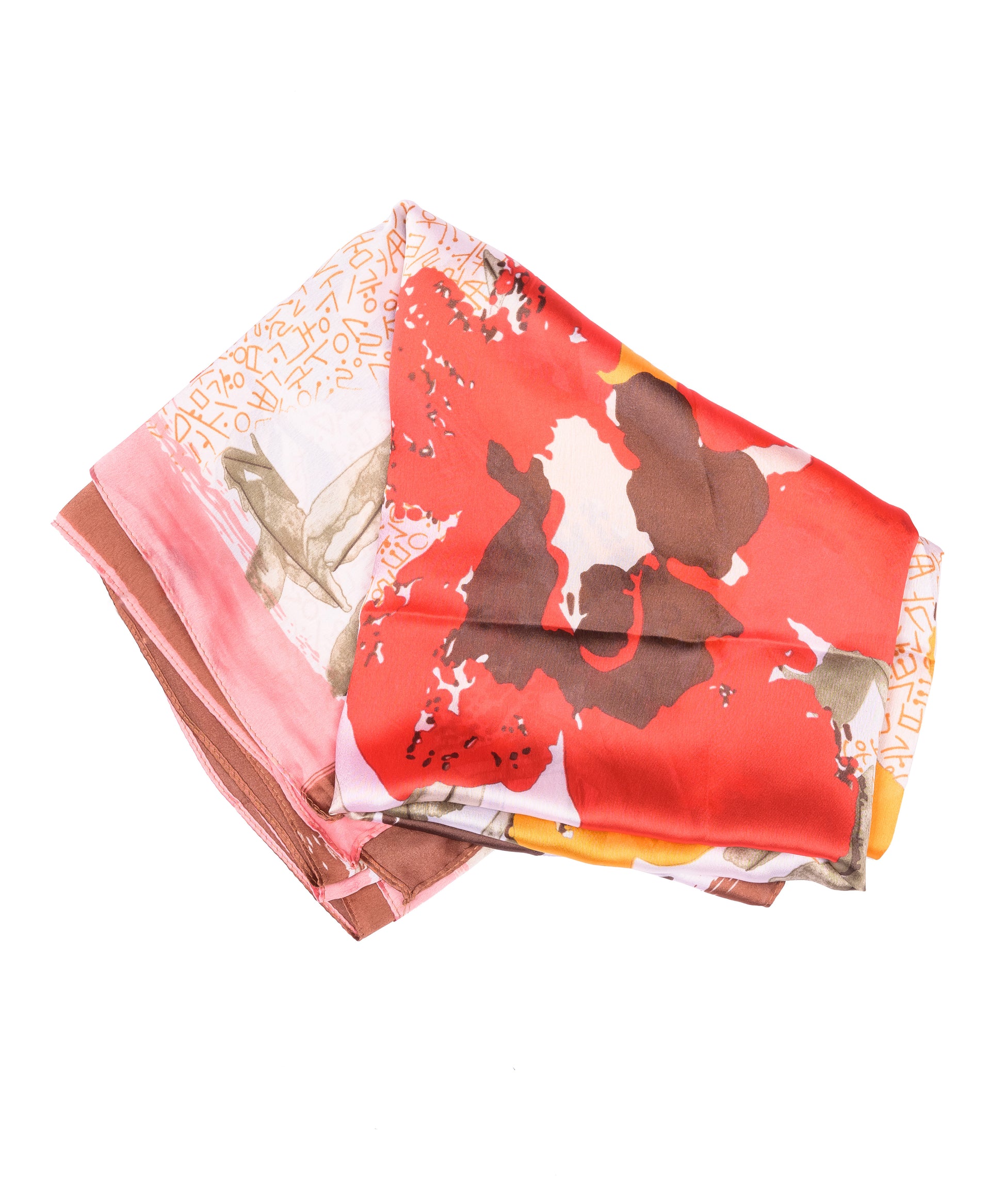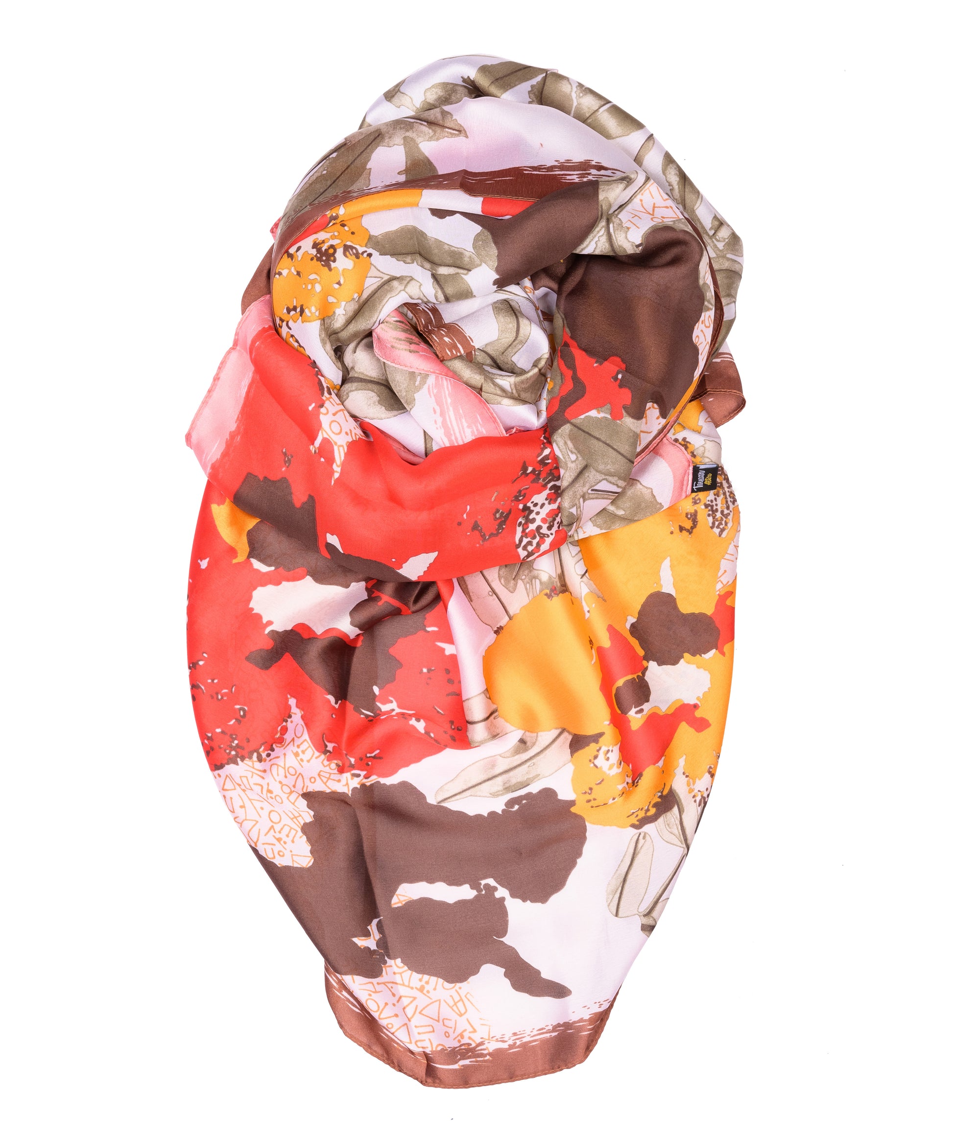 An elegant silk scarf featuring an abstract pattern in warm autumn tones. The design showcases a blend of coral red, golden yellow, chocolate brown, and soft pink elements on a light background. The scarf has a smooth, flowing drape with a satin-like finish.