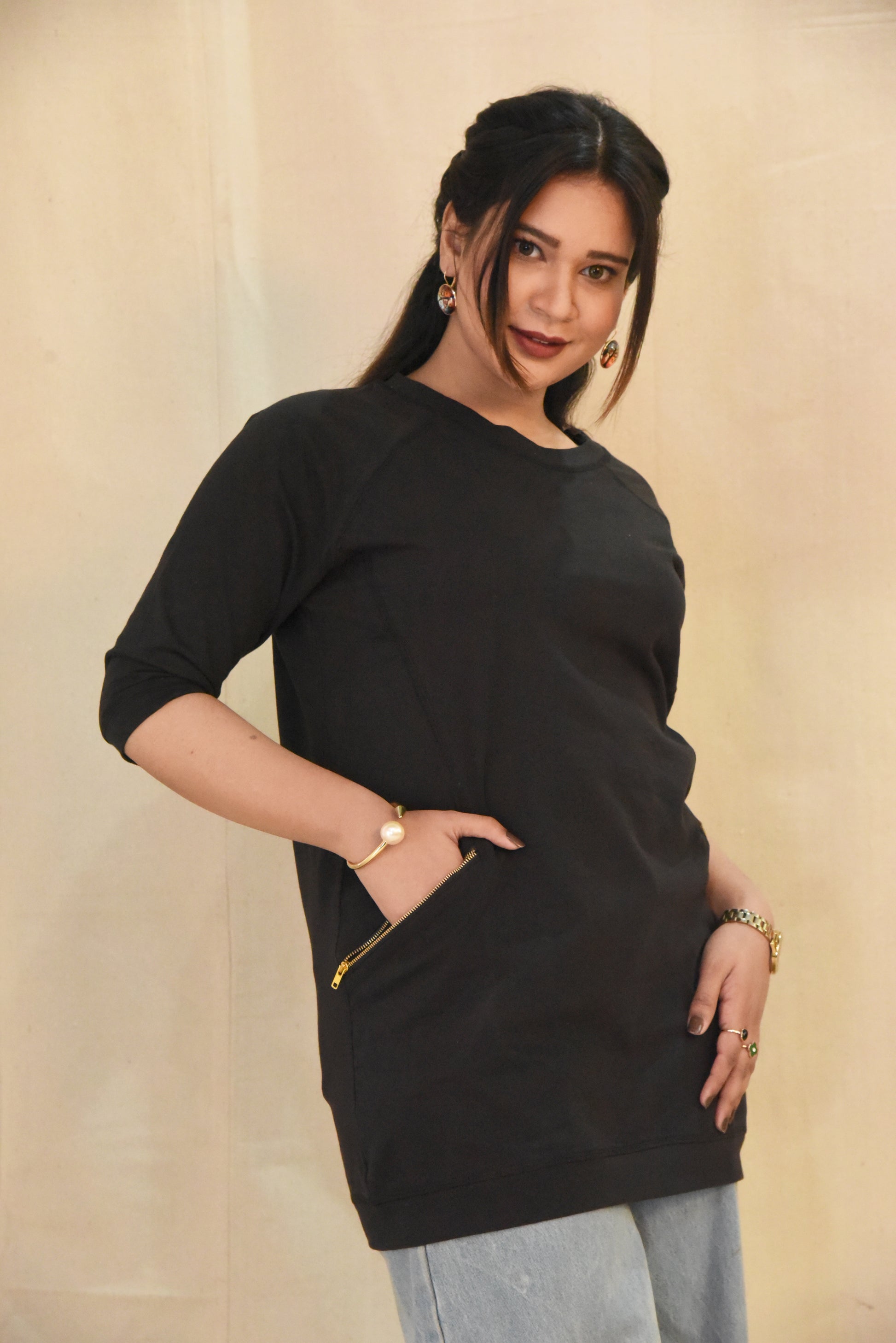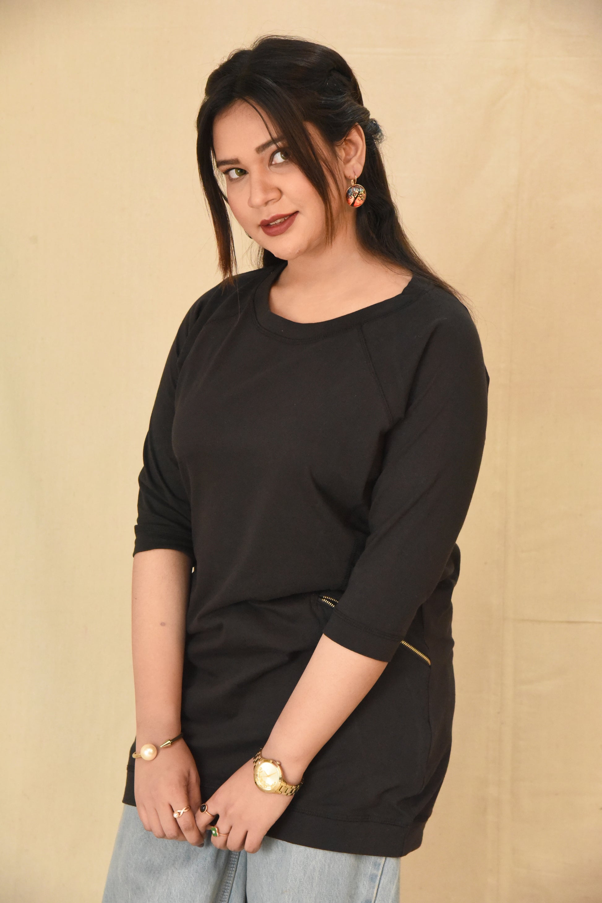Upgrade your casual style with this sleek women's black raglan t-shirt. Featuring a relaxed fit, breathable fabric, and trendy front zipper details, this tee combines comfort with modern elegance. Perfect for everyday wear or layering, it pairs effortlessly with jeans, leggings, or skirts for a chic and versatile look.