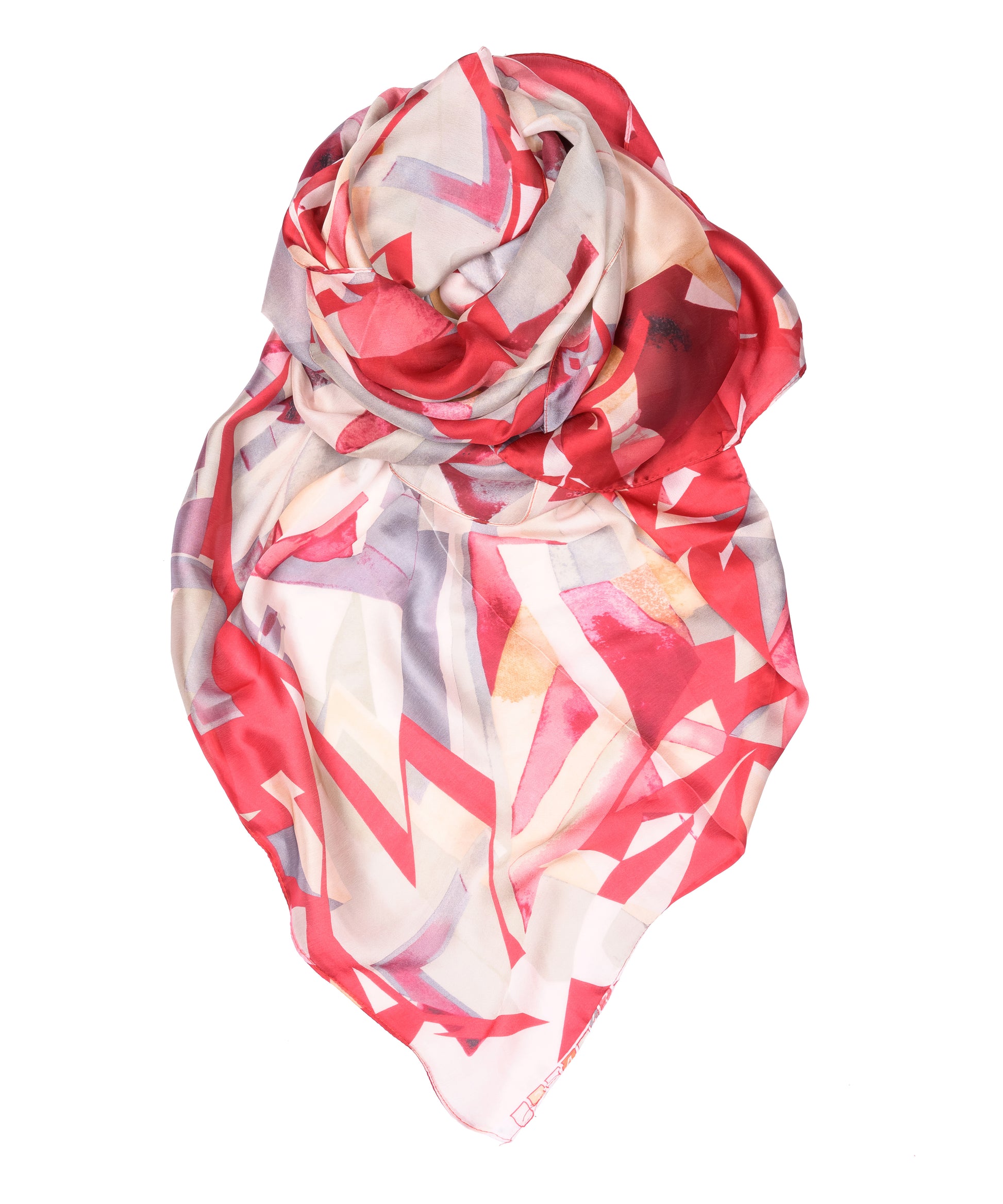 A sophisticated silk scarf featuring an abstract geometric pattern in vibrant coral red and soft pink tones on a cream background with subtle lavender accents. The modern design creates a dynamic visual effect that transitions beautifully when draped. Perfect for adding a contemporary pop of color to professional or casual outfits.
