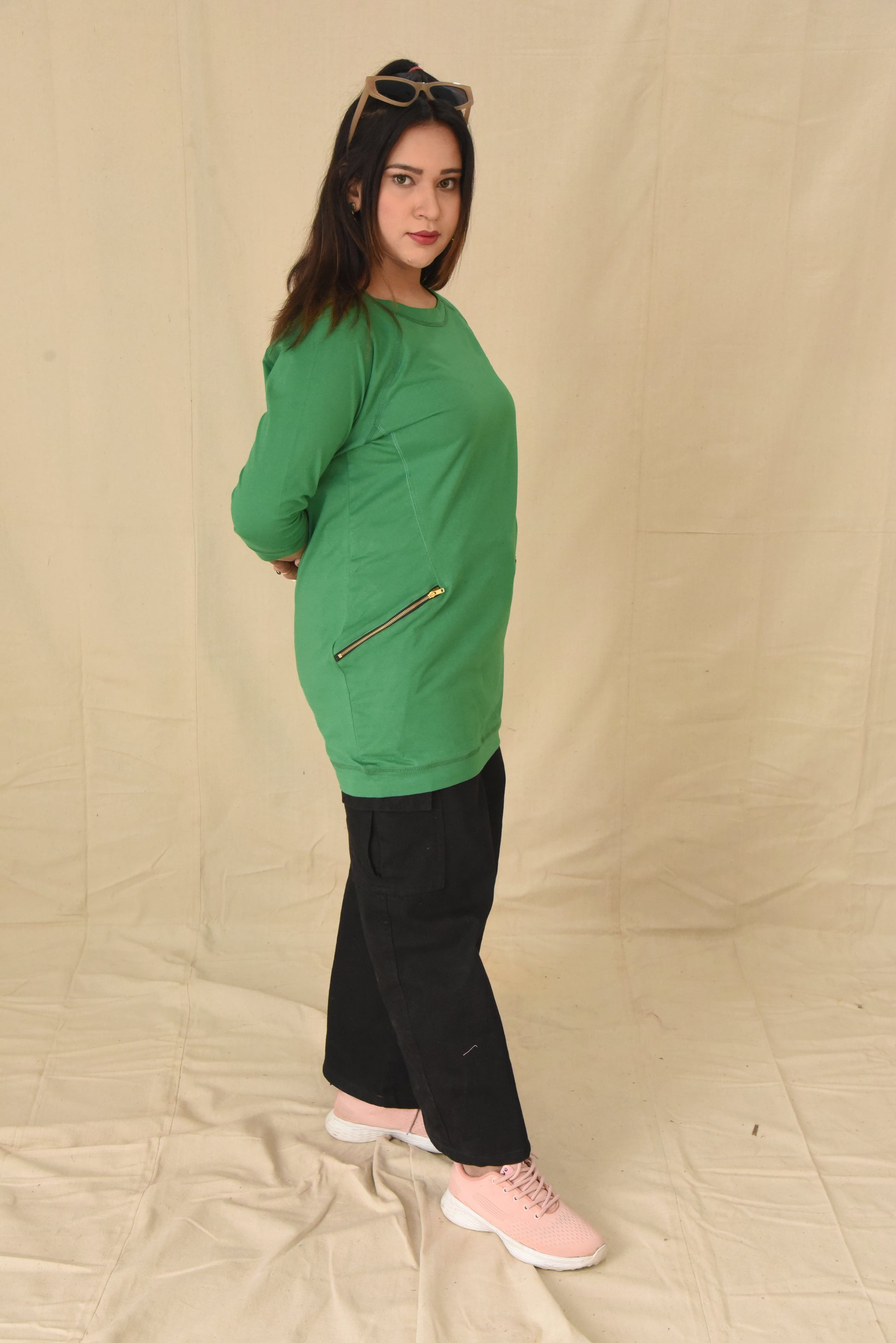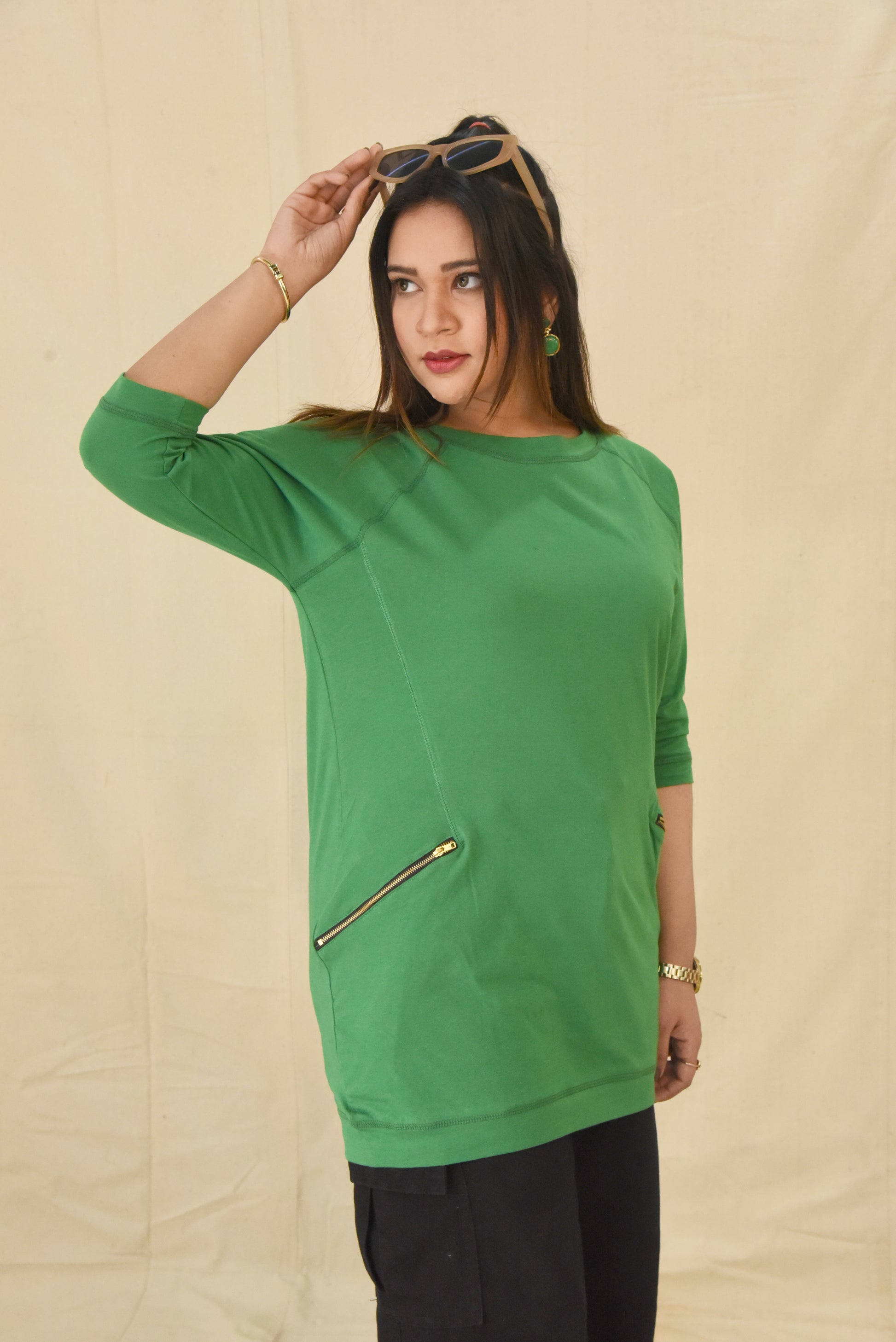 comfort and style, it features a relaxed fit, soft breathable fabric, and eye-catching front zipper details for a trendy touch. Perfect for casual wear or layering, this versatile tee pairs effortlessly with jeans, leggings, or skirts for an effortlessly stylish look.