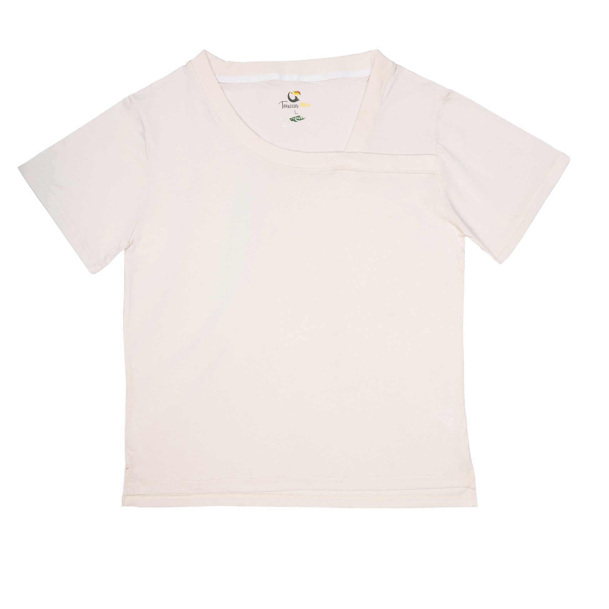 This women's white tee is a stylish and unique addition to any wardrobe. Designed with a relaxed fit, it features an asymmetrical neckline that adds a modern and sophisticated touch. The crisp white color gives it a timeless and versatile appeal, making it easy to pair with any outfit. Crafted from soft, breathable fabric, this tee ensures all-day comfort. Perfect for casual wear or layering for a chic, effortless look.