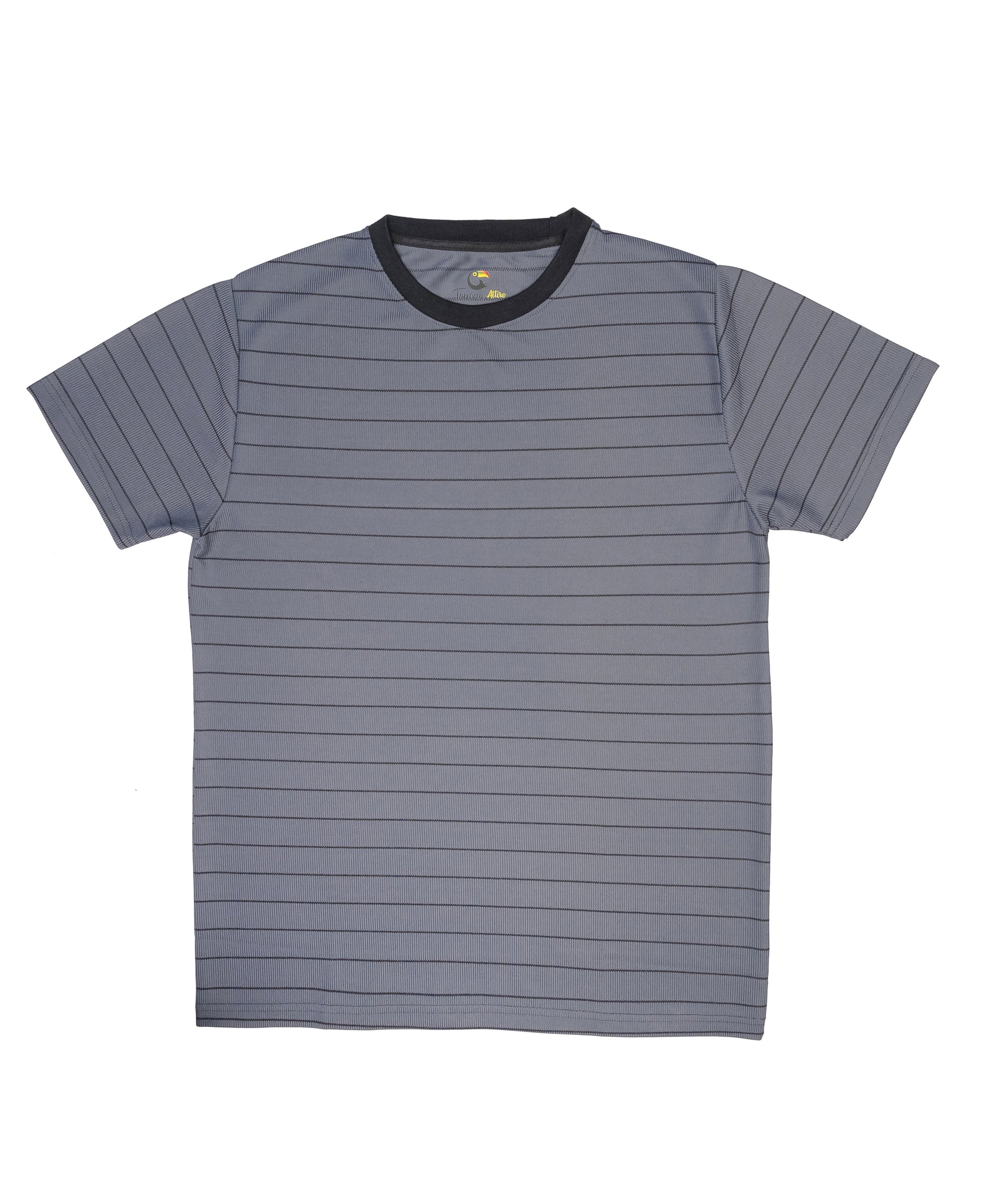 This sleek grey t-shirt features thin horizontal black stripes throughout, creating a refined and versatile look. The short sleeve design includes a black ribbed crew neckline for added structure. Crafted from a smooth cotton fabric, this t-shirt offers comfort with a touch of contemporary style, making it an essential piece for casual wardrobes.