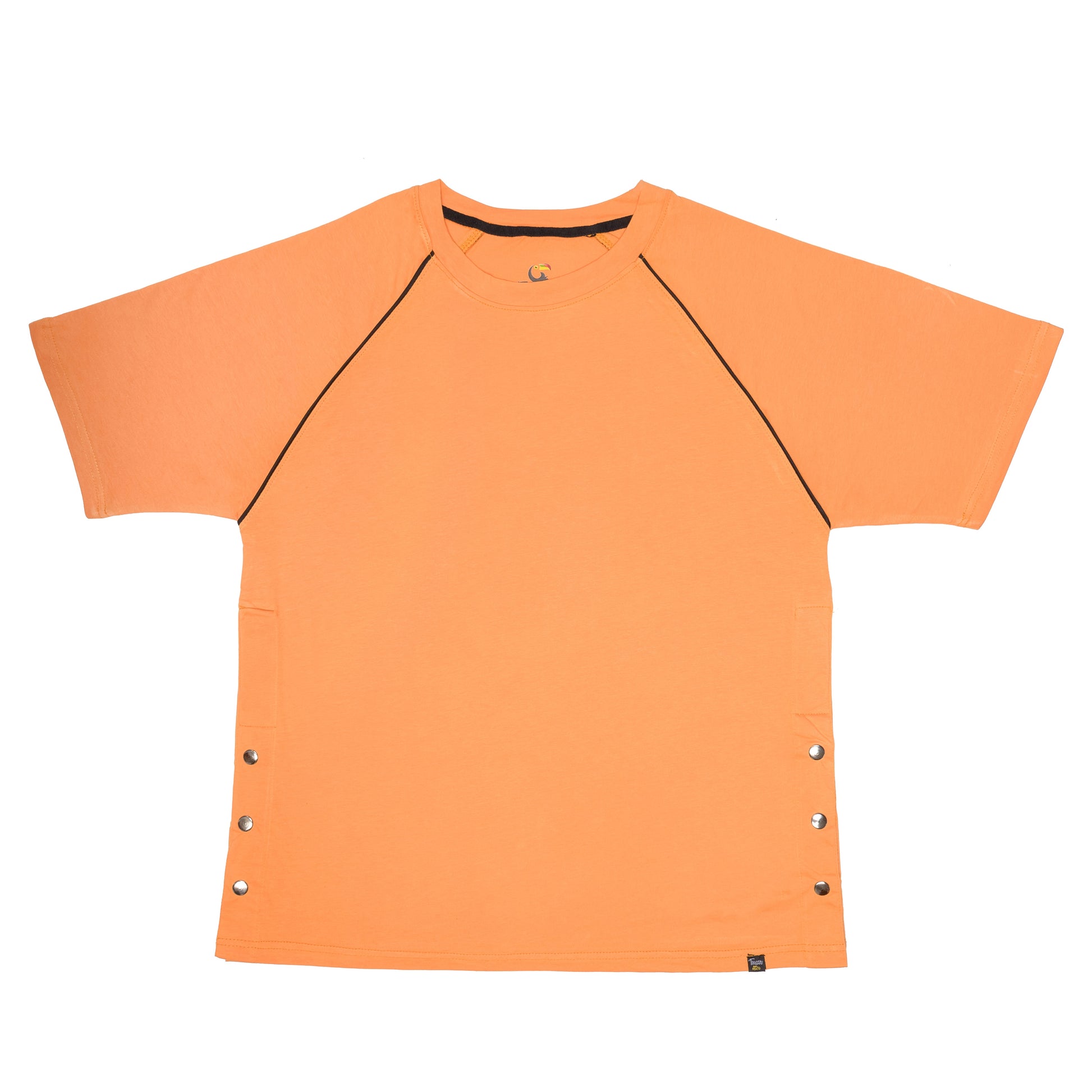 This women's orange tee is a stylish and comfortable choice for everyday wear. Featuring a relaxed fit, raglan sleeves with contrast black piping, and metallic button details on the sides, it blends casual elegance with a modern touch. Made from soft, breathable fabric, it ensures all-day comfort. Perfect for pairing with jeans, leggings, or shorts for a versatile look.