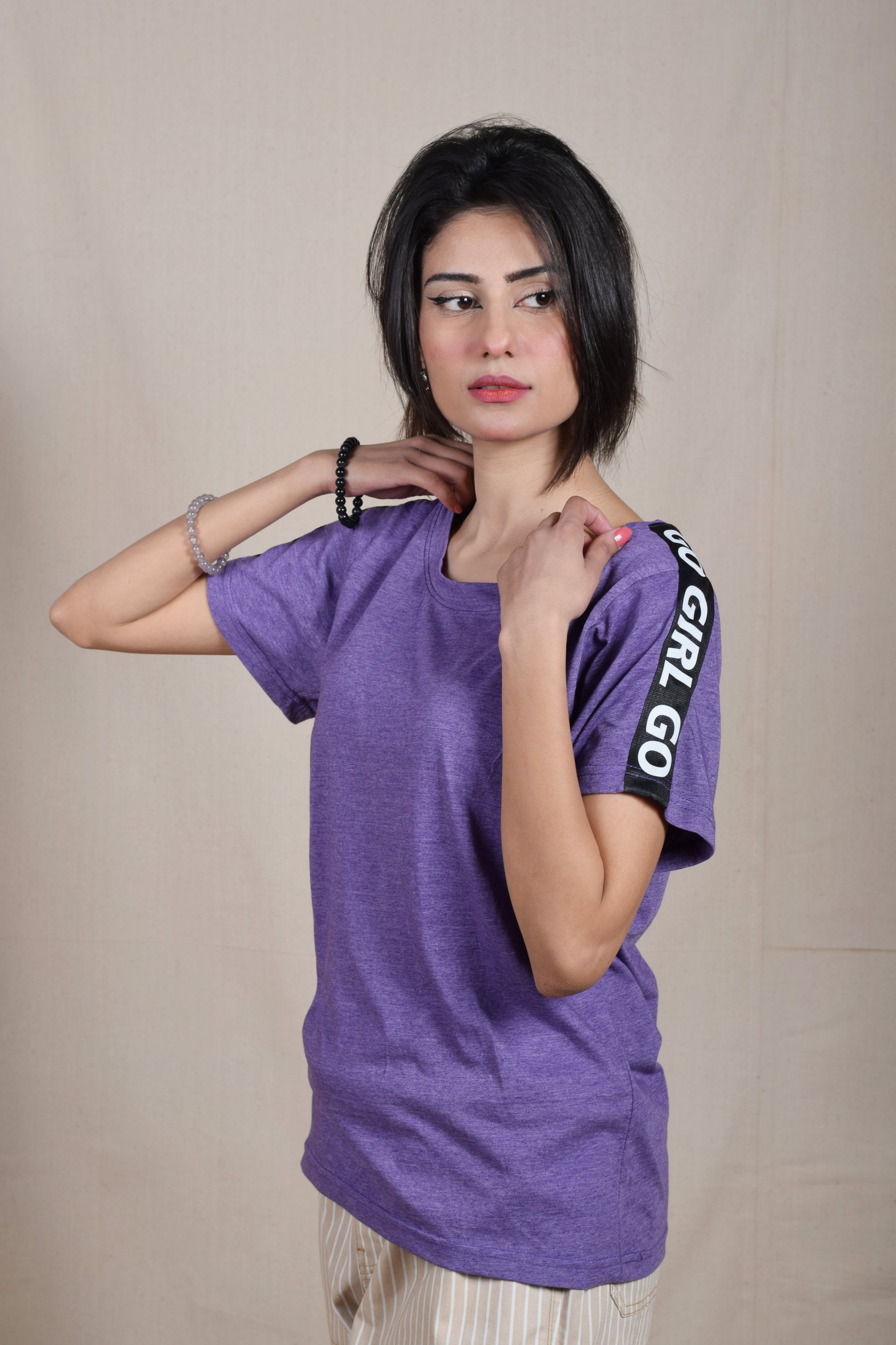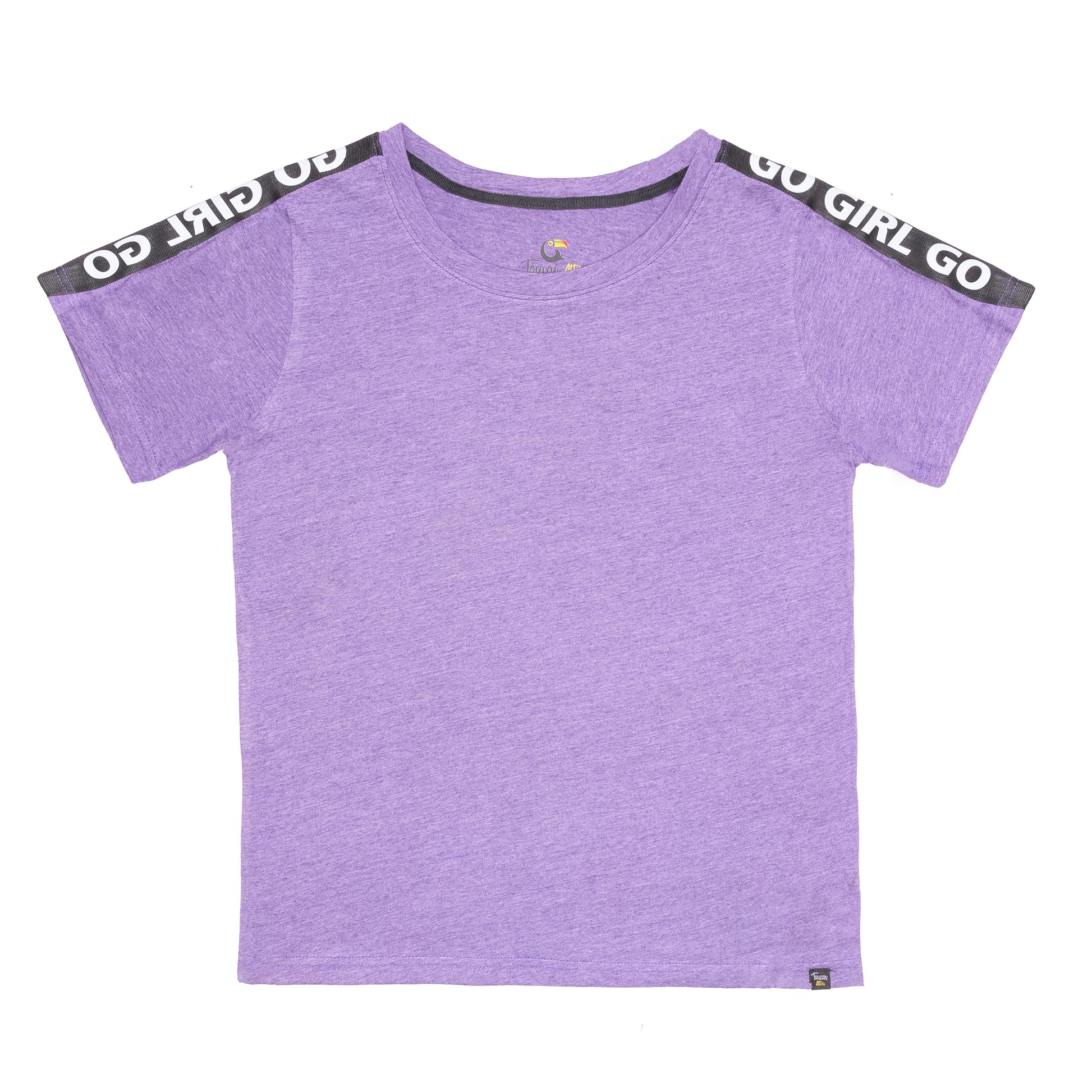This vibrant lavender crew neck t-shirt combines comfort with contemporary style. Featuring "GO GIRL" tape detailing along the shoulders, it makes a subtle statement while maintaining versatility. The heathered lavender fabric provides visual texture and a soft feel against the skin. Crafted from a lightweight cotton blend with a relaxed fit, this short-sleeve tee is ideal for warm weather outings or layering. The Toucan brand logo at the neckline