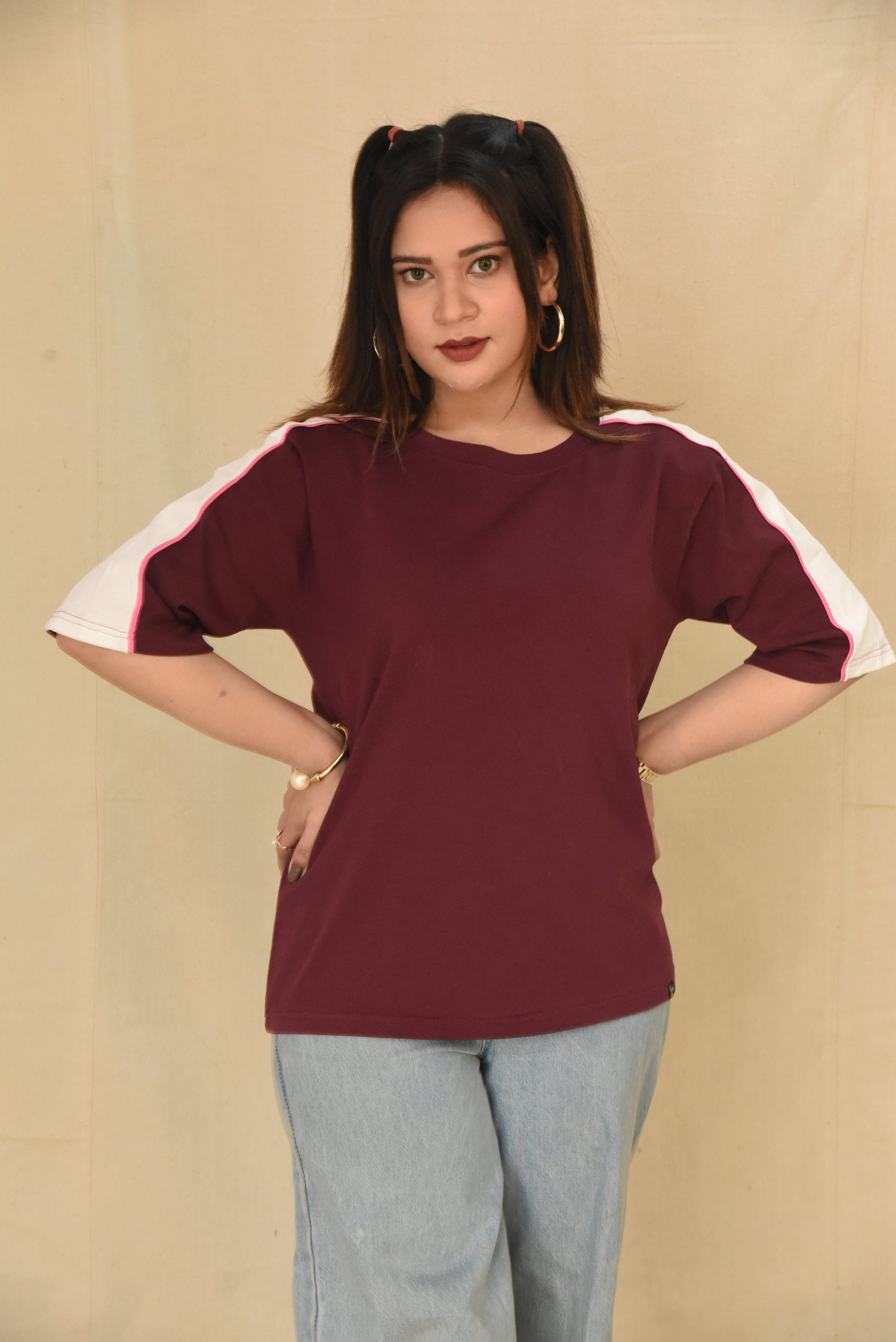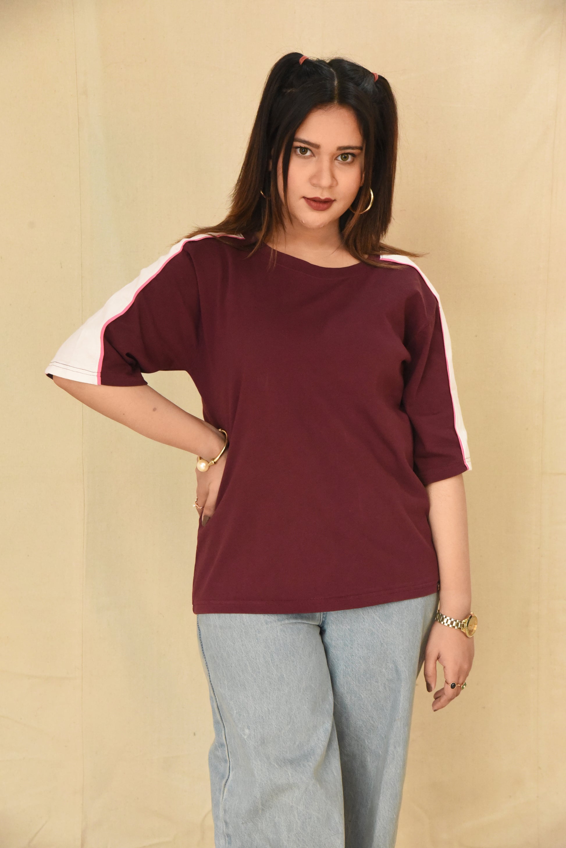 Add a bold touch to your wardrobe with this stylish maroon women's tee, featuring a trendy dual-tone shoulder design. Made from soft and breathable fabric, this short-sleeve t-shirt ensures all-day comfort while keeping you effortlessly chic. The contrasting white and black stripe detailing on the shoulders enhances its sporty yet fashionable appeal. Perfect for pairing with jeans, joggers, or shorts for a versatile and stylish look!