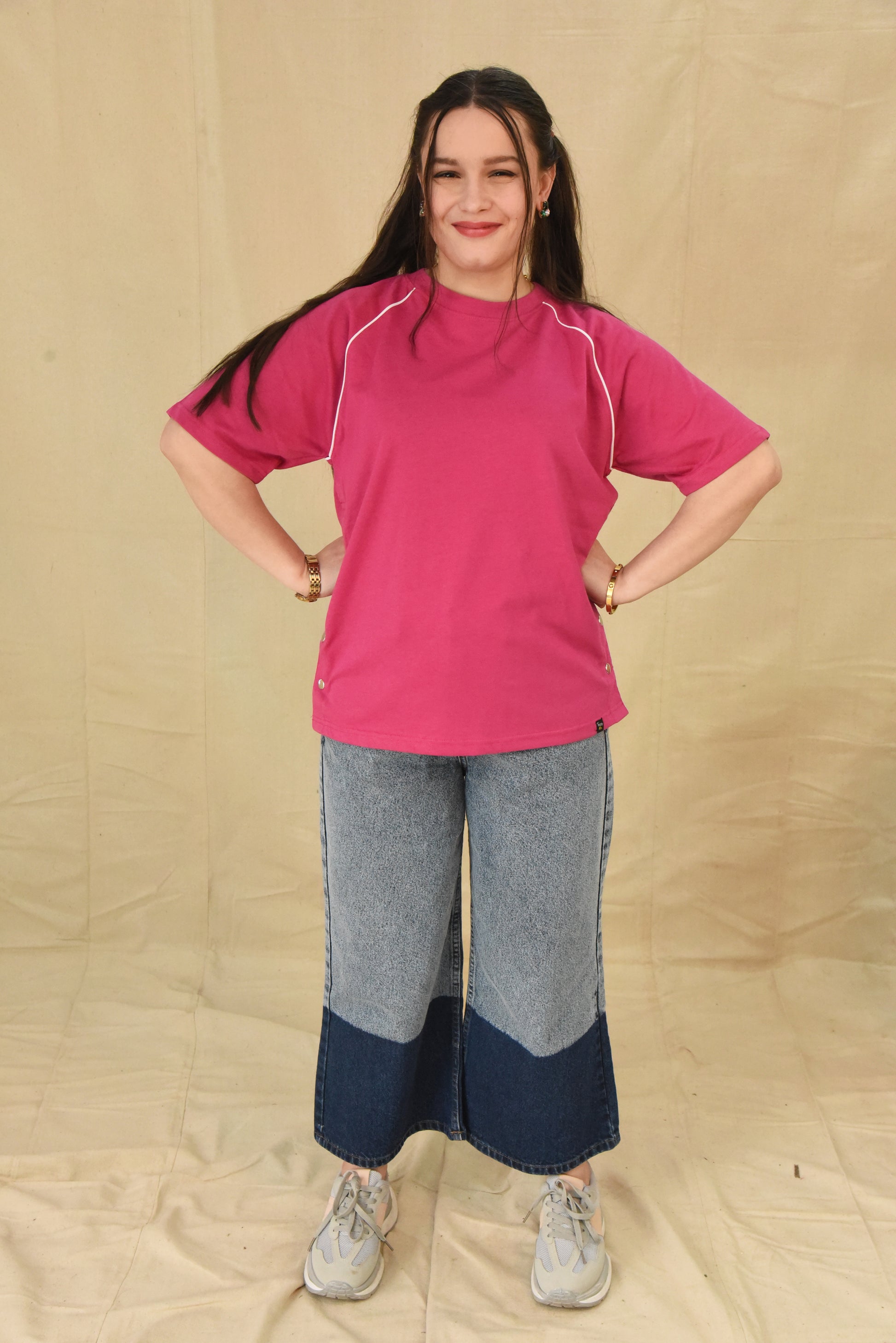 This women's pink tee is a stylish and comfortable choice for everyday wear. Featuring a relaxed fit, raglan sleeves with contrast black piping, and metallic button details on the sides, it blends casual elegance with a modern touch. Made from soft, breathable fabric, it ensures all-day comfort. Perfect for pairing with jeans, leggings, or shorts for a versatile look.