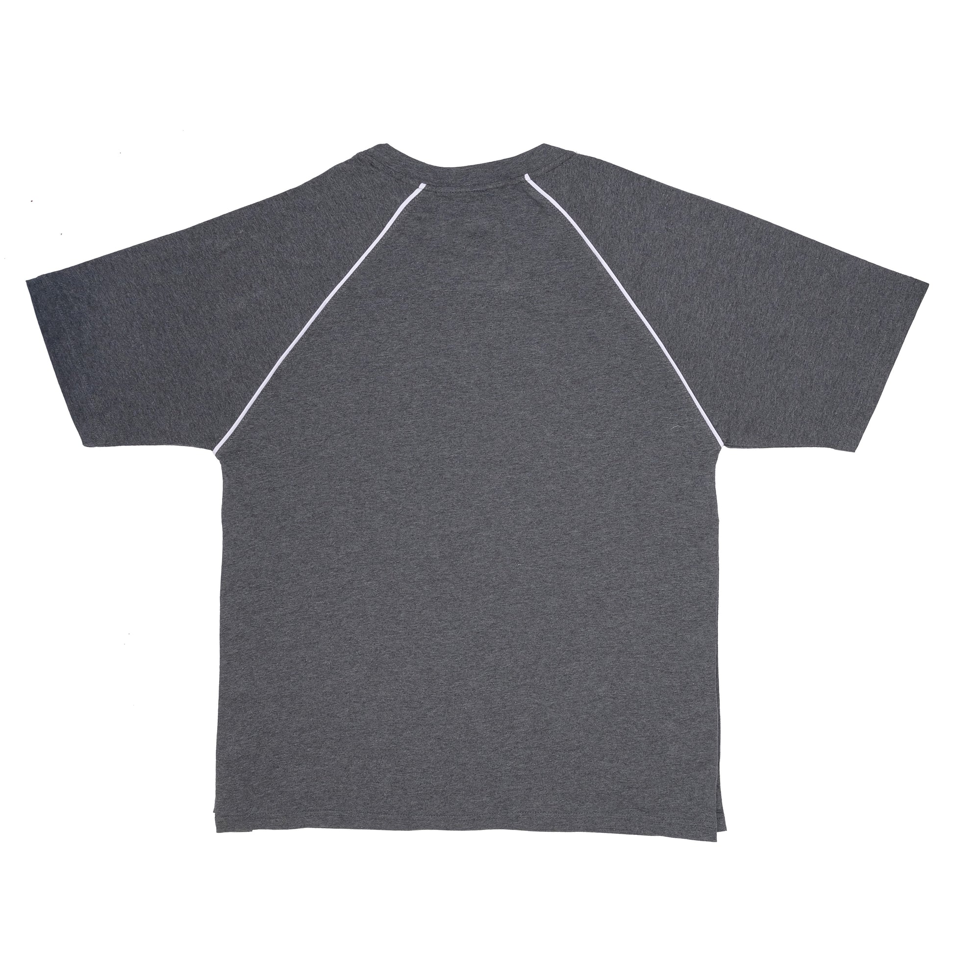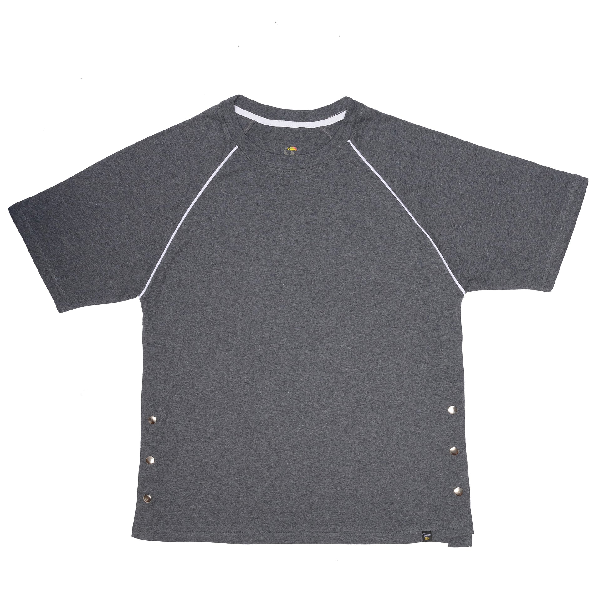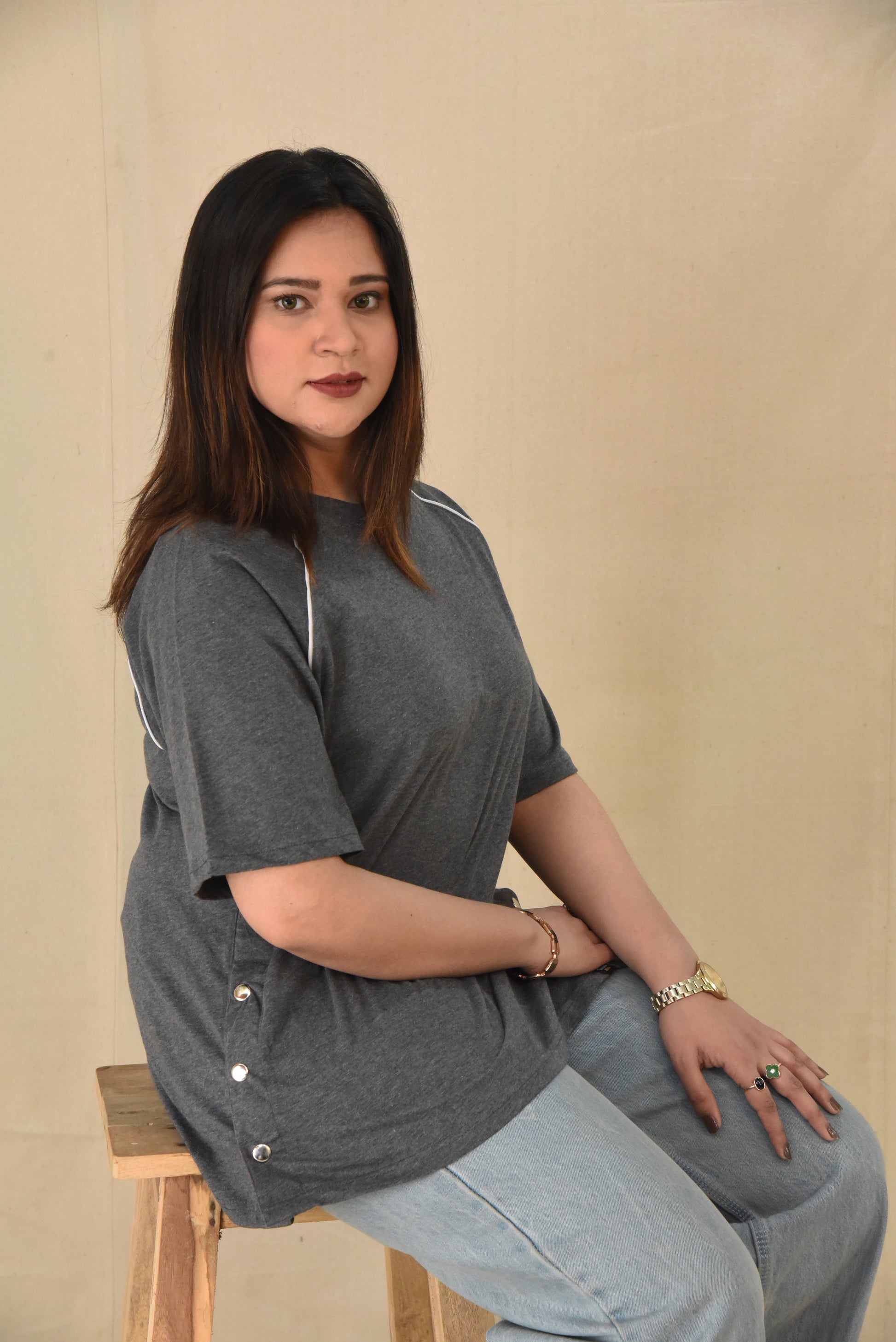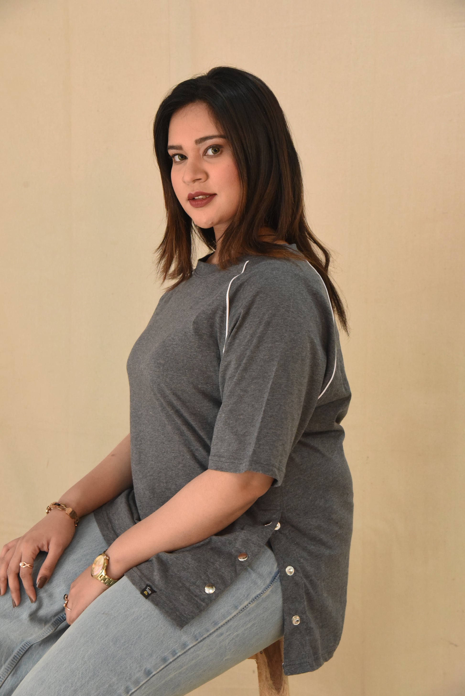 This women's grey tee is a stylish and comfortable choice for everyday wear. Featuring a relaxed fit, raglan sleeve with contrast black piping, and metallic button details on the sides, it blends casual elegance with a modern touch. Made from soft, breathable fabric, it ensures all-day comfort. Perfect for pairing with jeans, leggings, or shorts for a versatile look.