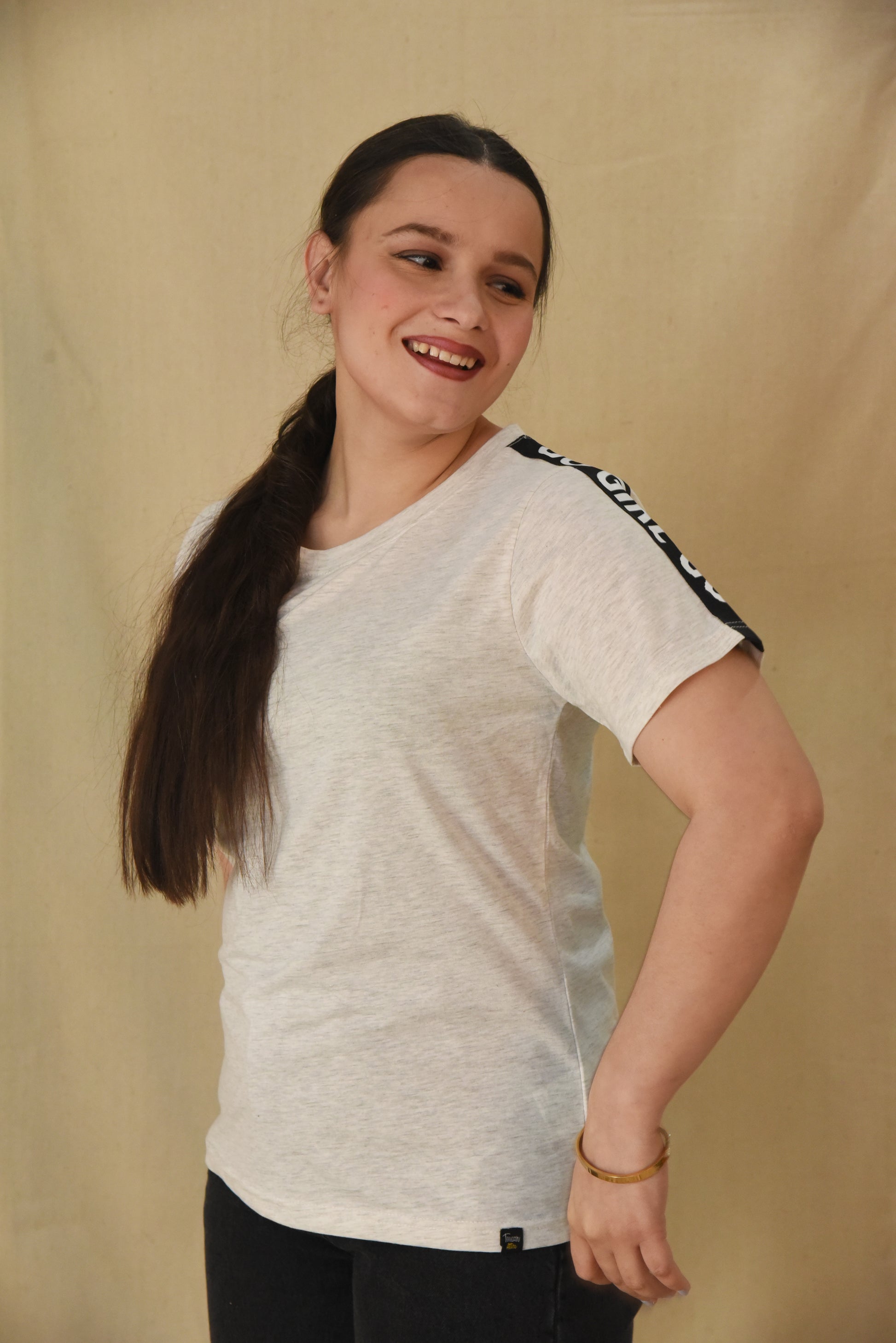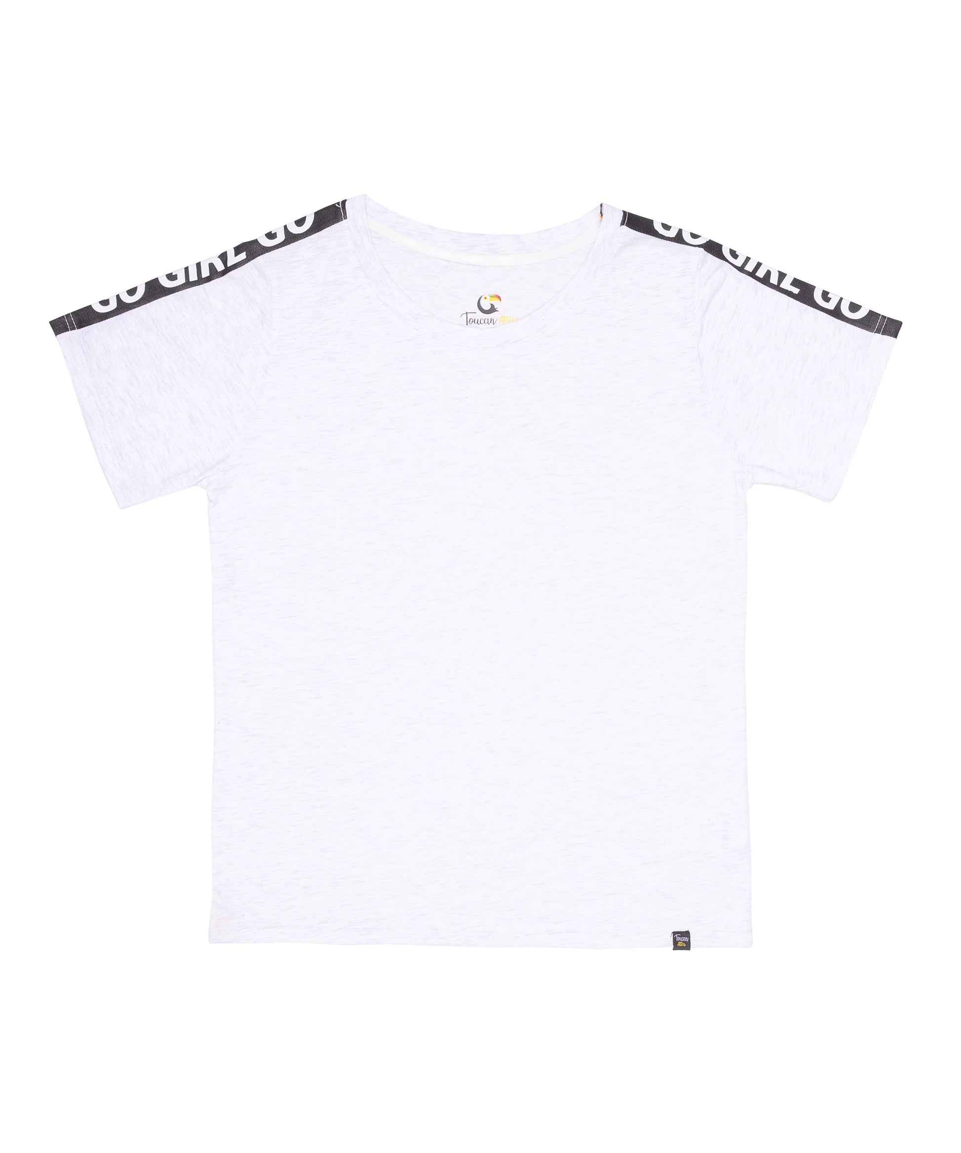This crisp white crew neck t-shirt offers a clean, minimalist design elevated by "GO GIRL" shoulder tape detailing. The lightweight cotton blend fabric ensures breathability and