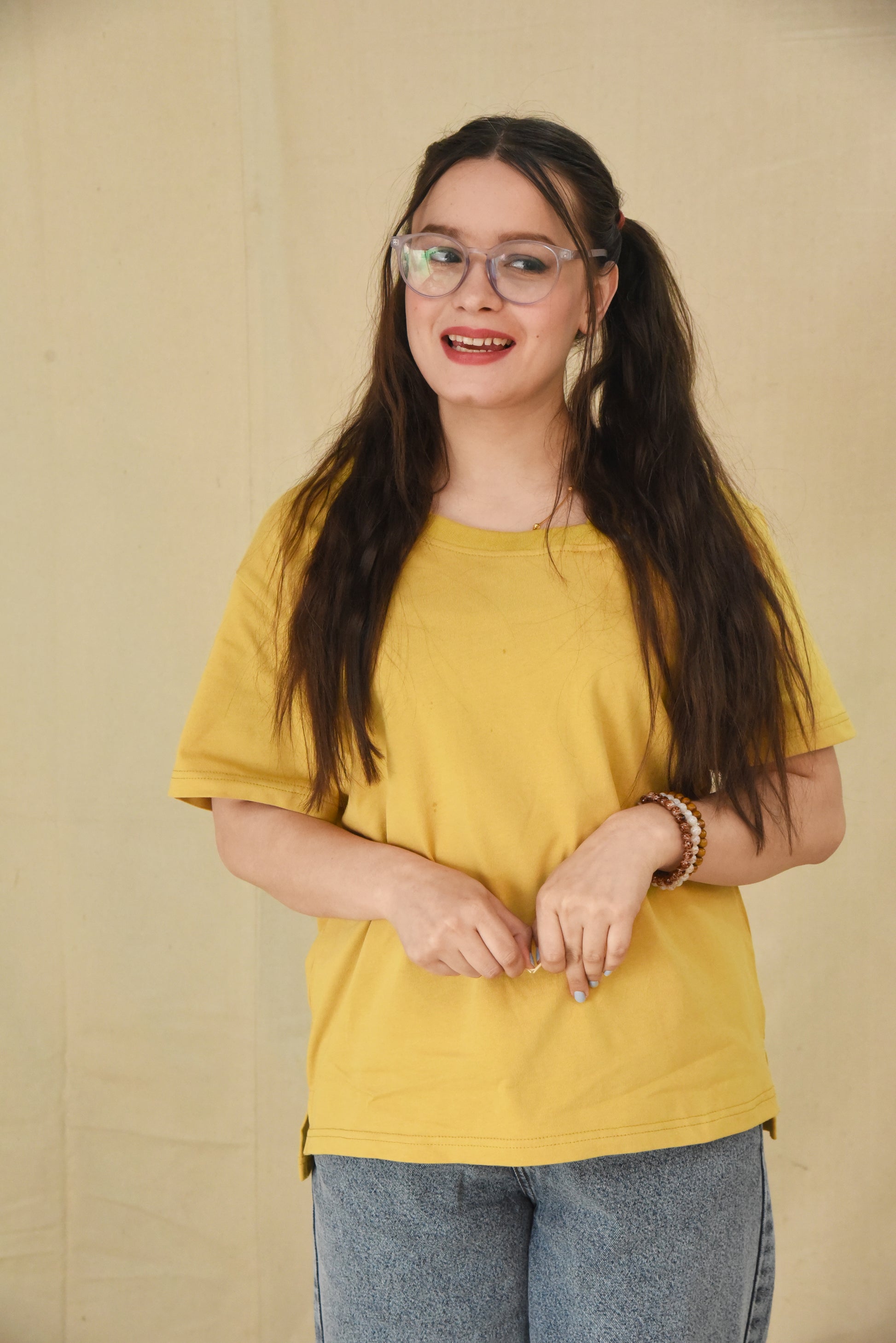 This women's mustard yellow tee is a stylish and unique addition to any ware laxed fit, it features an asymmetrical neckline for a modern and trendy to adds a bold yet sophisticated vibe, making it a versatile piece that pairs we Crafted from soft, breathable fabric, this tee ensures all-day comfort. Prefer layering for a chic, effortless look.