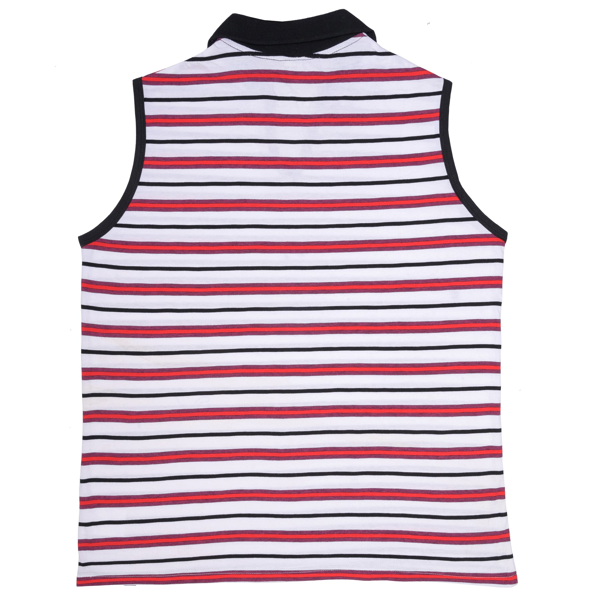Add a sporty-chic touch to your wardrobe with this stylish sleeveless striped top. Featuring bold red, black, and white stripes, this top is designed with a sleek black collar and a flattering V-neckline for a modern, sophisticated look. Made from soft, breathable fabric, it ensures all-day comfort and effortless style. Perfect for casual outings, layering, or pairing with jeans, shorts, joggers for a trendy, polished outfit!