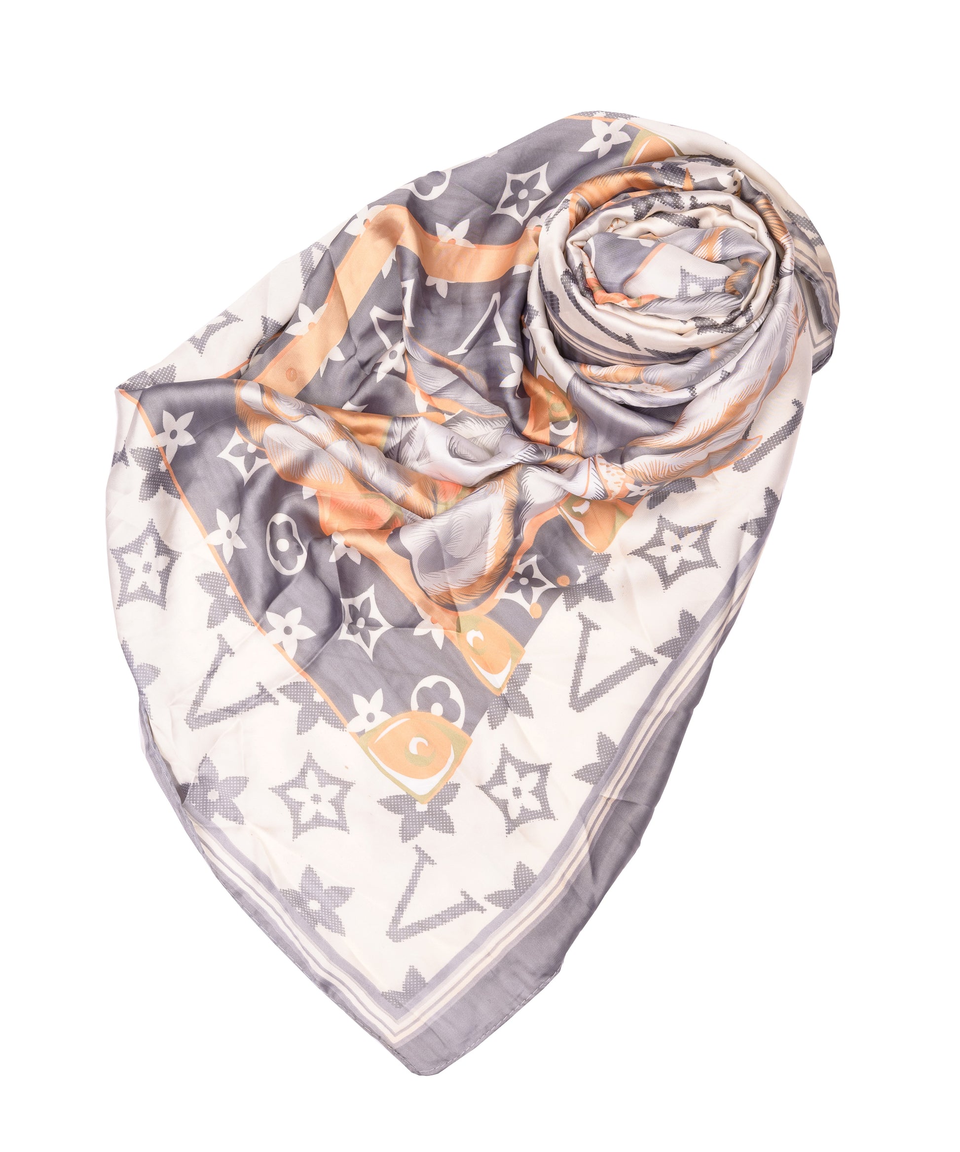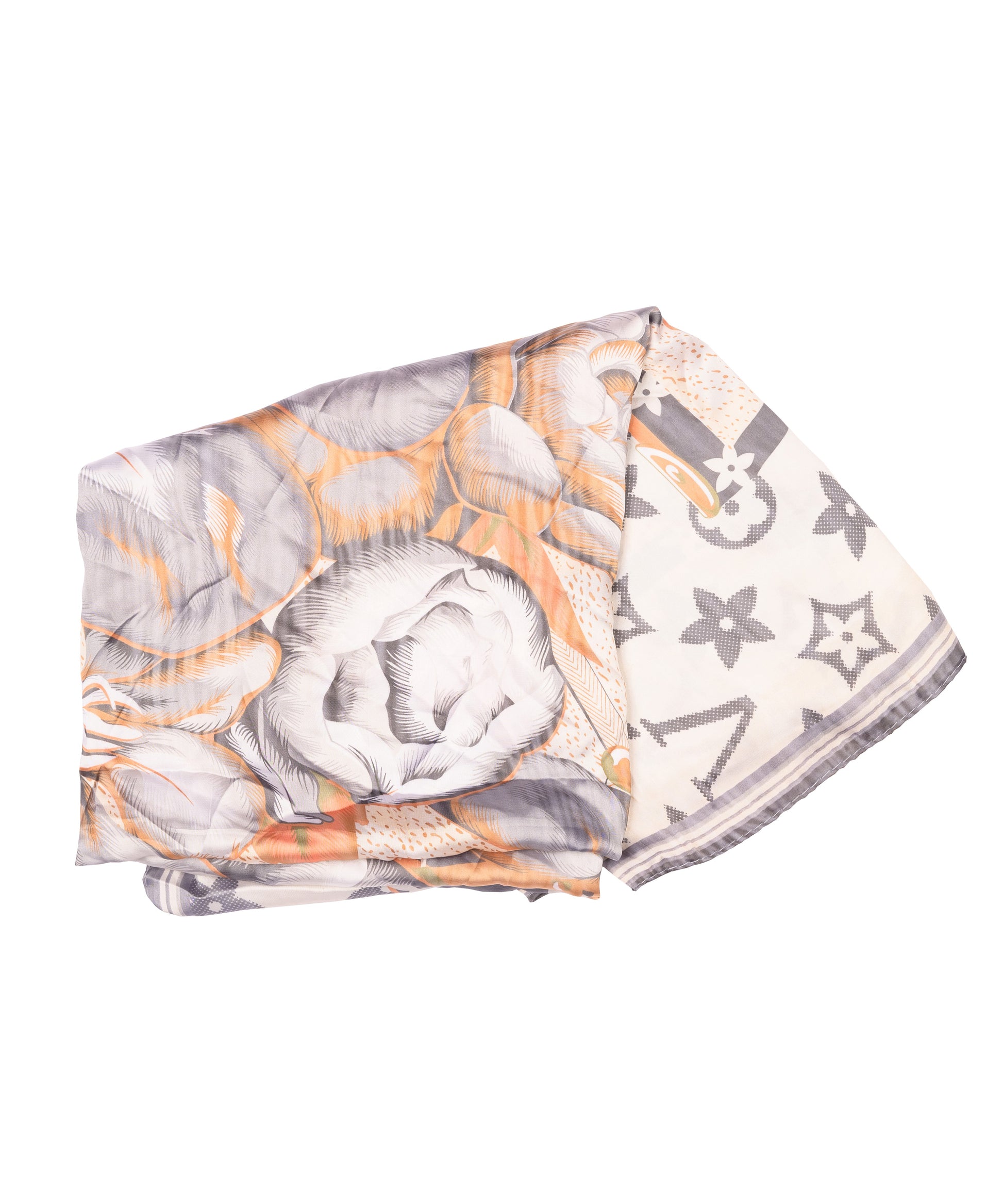 A vibrant purple and pink silk scarf with an artistic floral design. It features orange borders and accents with butterfly motifs. The scarf has a watercolor-like background with rich purple tones and pink floral elements, creating a romantic, artistic aesthetic.