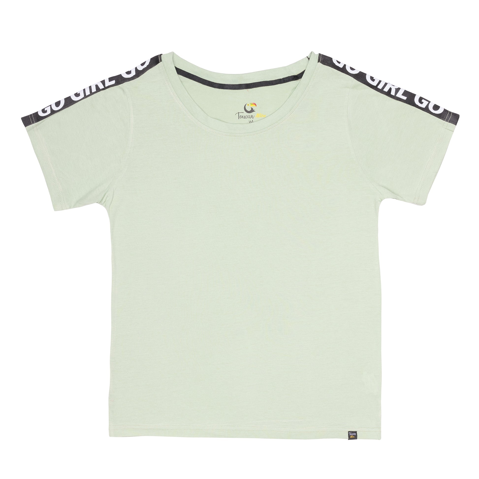 This crisp Mint Green crew neck t-shirt offers a clean, minimalist design elevated by "GO GIRL" shoulder tape detailing. The lightweight cotton blend fabric ensures breathability and comfort throughout the day. With its versatile solid white color and relaxed fit, this short-sleeve tee serves as the perfect canvas for any outfit. The distinctive Toucan logo at the neckline adds a touch of brand recognition, while the quality tag at the hem confirms its premium construction. An essential wardrobe staple for countless casual combinations.